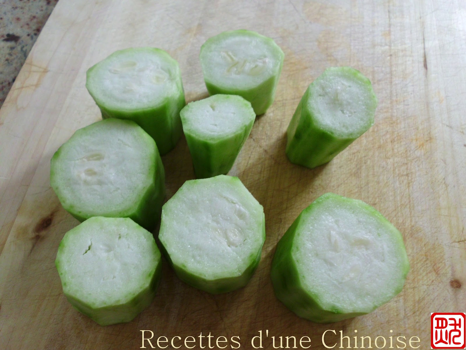 1. Épluchez le luffa et coupez la en grands morceaux (environ 4 cm de long).