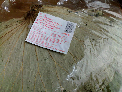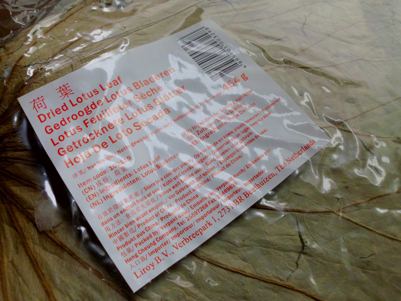 Les feuilles de lotus sont grandes et rondes, environ 40 cm de diamètre. On les achète dans les magasins asiatiques en France sous forme séchée dans un grand paquet en plastique. Les feuilles séchées se gardent pendant longtemps ( 1 ou 2 ans facilement).