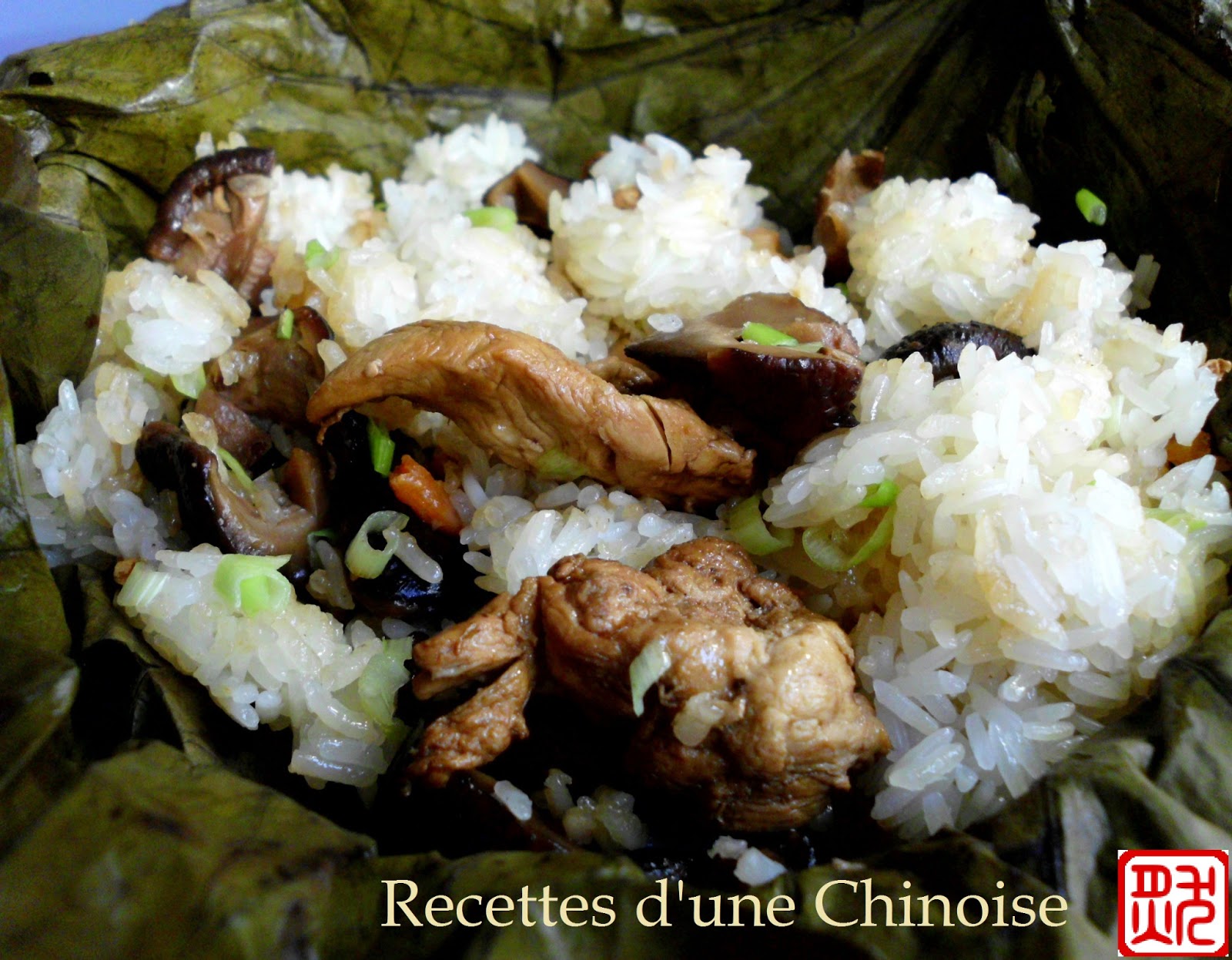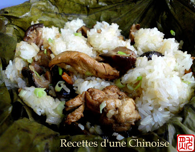 Du poulet avec des champignons shiitaké cuits avec du riz gluant dans des feuilles de lotus, ceci s'appelle Lo mai gai en cantonais, nuò mǐ jī 糯米鸡 en chinois mandarin.