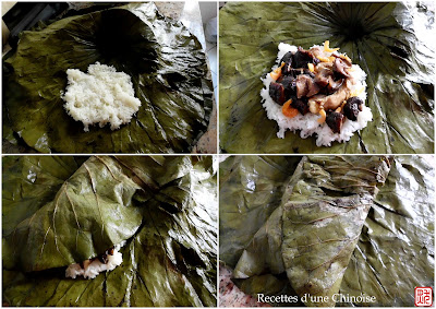 Sortez les feuilles de lotus, posez les sur un plan de travail (la face brillante de la feuille vers le haut). Mettez la moitié de riz au centre de feuille. Mettez les morceaux de poulet, les champignons et le jus de cuisson, ainsi que les morceaux de lap cheong et les crevettes séchées ramollies.