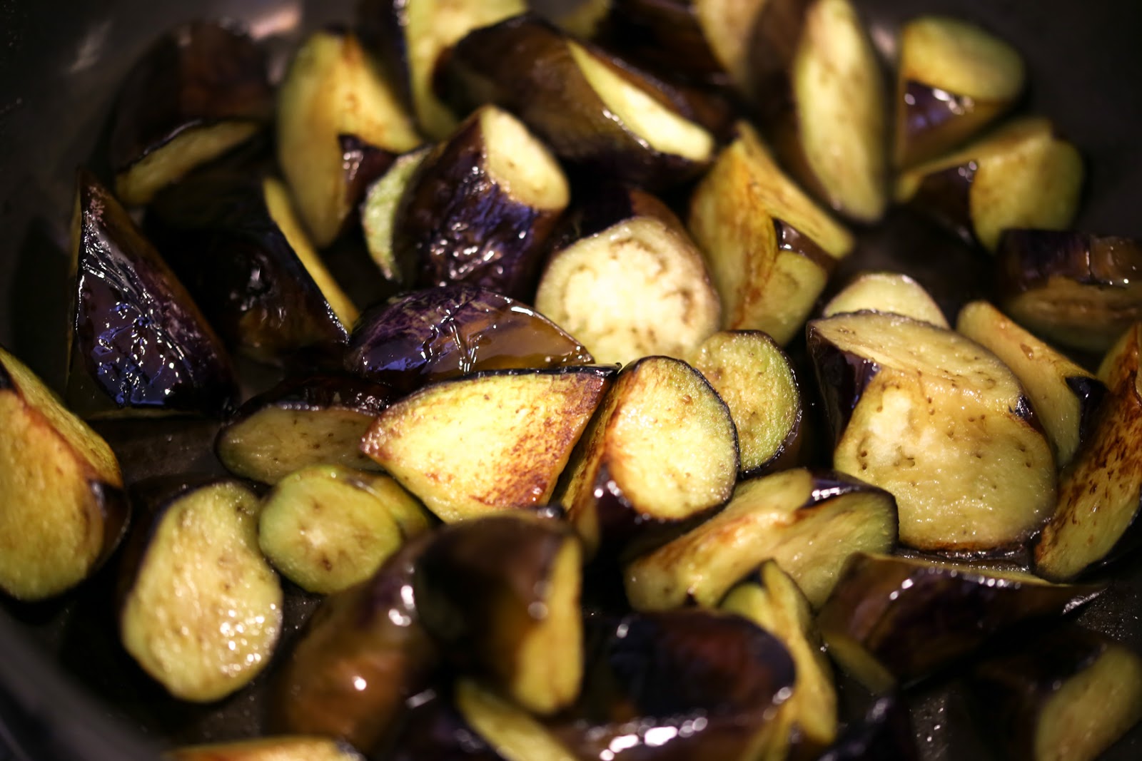 Chauffez l'huile dans un wok ou dans une sauteuse à feu fort, mettez les aubergines, faites-les sauter en remuant constamment le wok, une fois que les morceaux sont enrobés d'huile de façon homogène et qu'ils sont un peu colorés, baissez le feu et laissez cuire doucement en remuant de temps en temps.