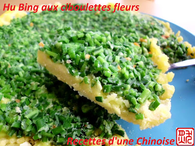 La garniture classique pour cette "pizza" chinoise est "Jiu Cai" (ciboulettes chinoises) ou "Jiu Cai Hua" (ciboulettes fleurs chinoises). J'ai choisi le 2em cette fois parce que j'aime son côté croquant.