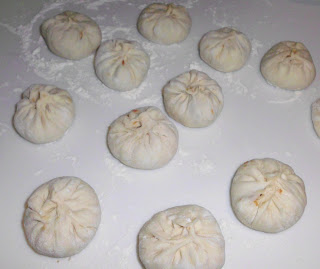 5. Prenez une pâte sous forme de disque, pressez avec les doigts le bord pour agrandir un peu la pâte et rendre le bord moins épais. Mettez 3/4 c. à soupe bombée de farce au milieu de disque (si c'est la première fois, il vaut mieux prendre un peu moins de farce), ramenez le bord vers le milieu en faisant des petits plies (regardez le vidéo "pliage de BaoZi" dans ma recette "BaoZi", cliquez ici).