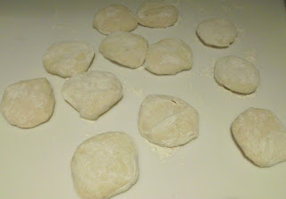 4. Quand la pâte est prête, ajoutez la levure chimique, puis pétrissez pour que la pâte soit homogène. Façonnez la pâte sous forme de saucisson long, puis coupez la en morceaux équivalents (environ 3 cm cube), ensuite abaissez ces morceaux en disques ronds avec la paume de la main (4 mm d'épaisseur environ).