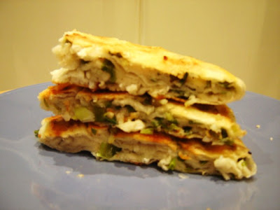 Les recettes pour cette galette à base de farine de blé sont multiples sur le net, avec de l'eau bouillante ou de l'eau froide (ici, ma version avec de l'eau bouillante), avec de la levure (recette ici) ou sans, avec le you su à base de farine ou à base de farine de maïs... Je les aime toutes, mais j'aime particulièrement quand elle contient beaucoup de ciboules et qu'elle est crousti - fondante !😁