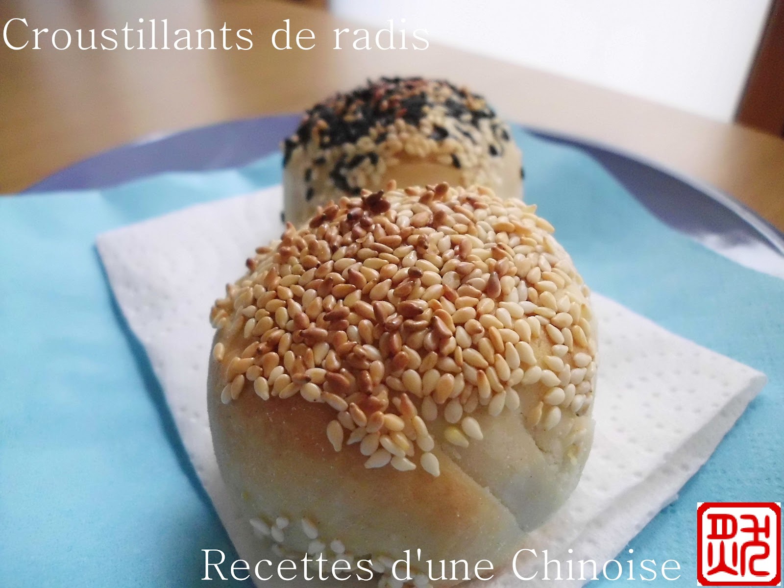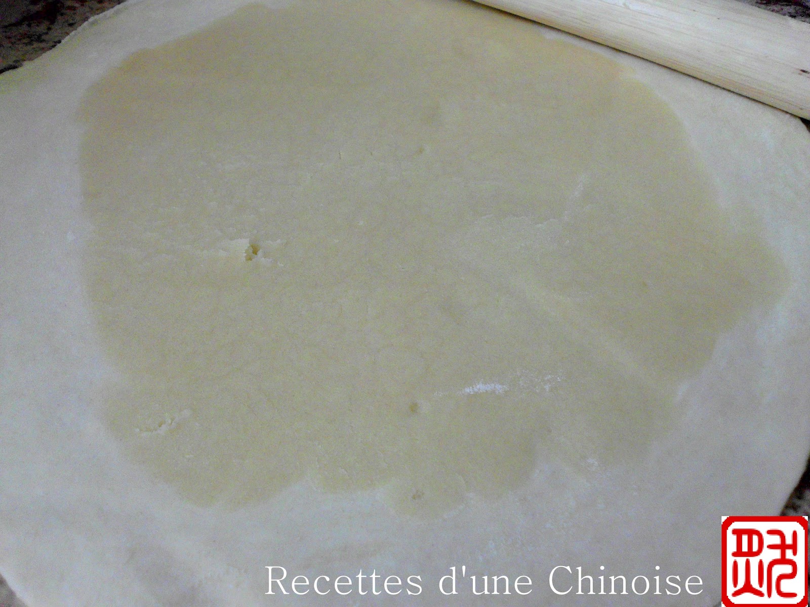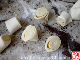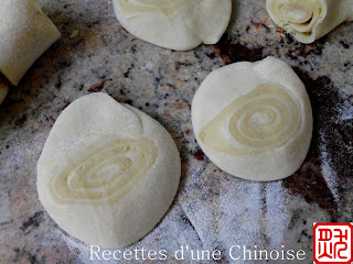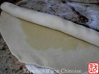 Pour ces croustillants de radis, on prépare une pâte croustillante qui est une des pâtes les plus courantes pour les gâteaux sucrés ou salés chinois. Cette pâte est un mélange de 2 pâtes: l'une s'appelle "la pâte huilée croustillante"; l'autre, "la pâte d'huile-eau". On superpose ces 2 pâtes et on abaisse en une seule pâte avec 2 couches.