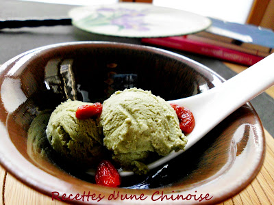 J'ai fait cette glace avec le thé vert chinois en poudre, ce qui est différent de Matcha (japonais). En fait, la méthode de torréfaction de ces deux thés est différente: les feuilles de thé vert chinois sont chauffées dans des bassines, tandis que celles de thé vert japonais, à la vapeur. Ceci explique la différence de couleur entre ces deux thés : celle de thé vert chinois: vert-jaune, celle de thé vert japonais: vert vif.