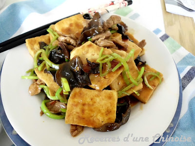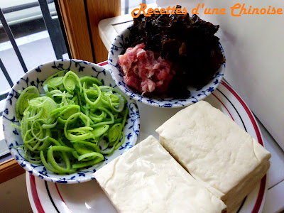 Ingrédients: 400 g de tofu ferme, 80 g de filet de porc, 50 g de poireau (prenez la partie verte claire), 10 g de champignons noirs séchés, 1 c. à soupe rase de pâté de soja fermenté aux piments, 1 c. à soupe de sauce de soja claire, 2 c. à soupe d'huile végétale, 1 c. à soupe de vin jaune chinois (Vin de "Shao Xing", aussi appelé vin "Hua Diao"), 1 c. à café de sucre en poudre ou de miel, 1 c. à café de fécule de maïs ou de pomme de terre, 2 c. à soupe d'eau pour mélanger avec la fécule.