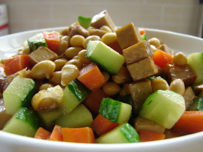 Ingrédients: 50 g de fêves de soja séchées, 100 g de tofu fumé, 1 demi concombre, 1 carotte de taille moyenne, 1 c. à soupe de sauce de soja claire, 1 c. à café de vinaigre, 1.5 c. à soupe d'huile, sel et poivre, quelques gouttes d'huile de sésame, 1 petit oignon et 2 tranches fines de gingembre.